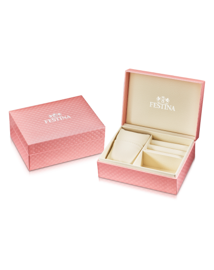 Voici la nouvelle collection Festina Boyfriend Collection, des montres au accent de l'élégance et du raffinement. Ce modèle ref F20504/2 se compose d'un boitier rond en acier argenté, d'un bracelet en acier argenté et d'un cadran rose nacré avec strass. Le mécanisme est à quartz, elle est étanche 100m et garantie 2ans comme toutes les montres Festina vendues