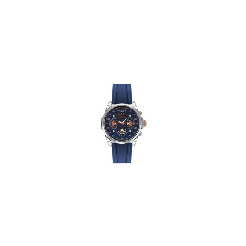 LeeCooper LC07432.399 Montre Homme Analogique Boitier rond en métal argenté Cadran soleillé bleu Bracelet en silicone bleu Multifonction