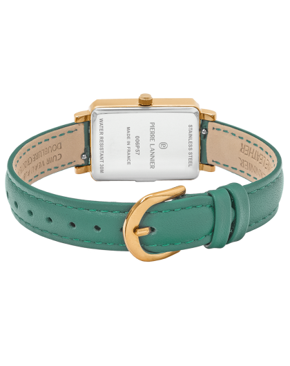 Montre analogique (2 aiguilles ), boitier rectangulaire 28.4x21mm en acier doré, cadran vert, bracelet en cuir vert, étanche 30m.