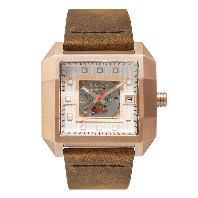 Cette montre Homme CCCP à Dateur de la gamme Chakhava à un boitier Rectangulaire en Acier Inoxydable Doré Rose d'un diamètre de 42mm, un cadran Blanc et un verre Minéral. Son bracelet est en Cuir Véritable Marron. C'est une montre Automatique à affichage Digital d'une étanchéité de 3 ATM qui bénéficie de la garantie internationale du fabricant de 2 ans