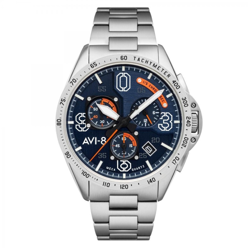 Cette montre Homme AVI-8 Chronographe et Dateur de la gamme Hawker Hunter à un boitier Rond en Acier Inoxydable Noir d'un diamètre de 45mm, un cadran Noir et un verre Minéral. Son bracelet est en Cuir Véritable Marron. C'est une montre Quartz à affichage Digital d'une étanchéité de 5 ATM qui bénéficie de la garantie internationale du fabricant de 2 ans