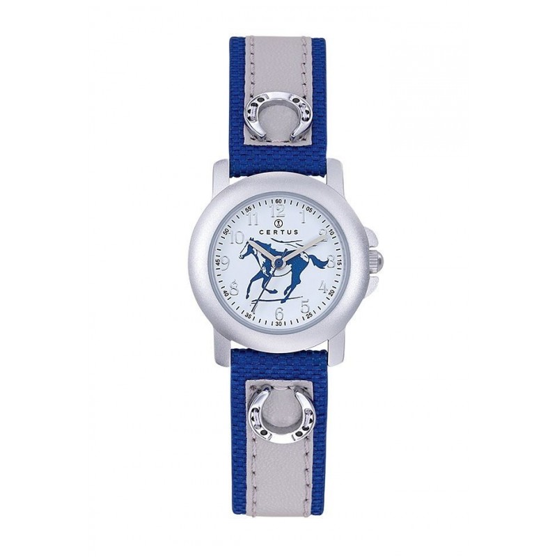 Cette montre junior de la marque Certus, référence 647482, est une montre classique. Cette montre se caractérise par un cadran rond blanc motifs cheval en Aluminuim, un verre minéral, et un mouvement à Quartz. Son affichage est Analogique (Aiguiles). Cette montre Certus possède un bracelet fer à cheval cousu en synthétique. Les 2 bénéficient de la garantie internationale du fabricant de ans. Certus Montre Junior 647482